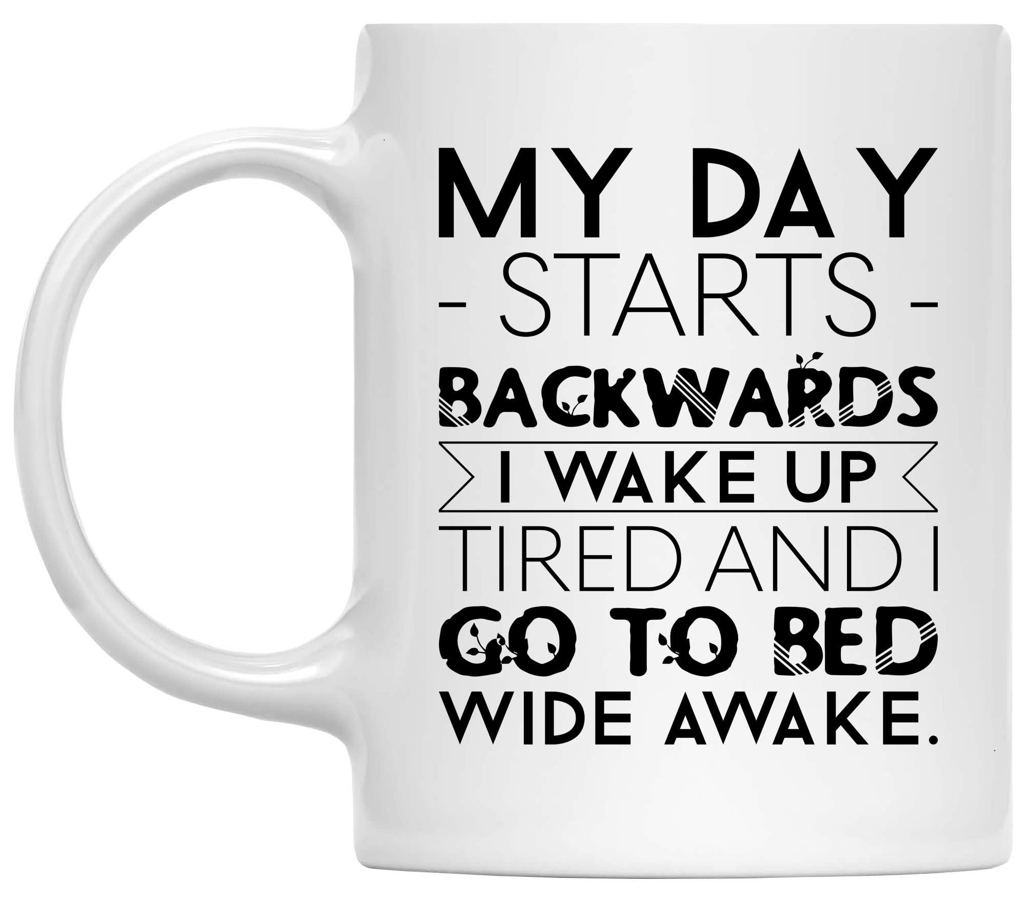 Amazon Com Funny My Day Starts Backwards I Wake Up Tired I Go To Bed Wide Awake Sarcastic Inspirational Quotes Memes Joke Sarcasm Sayings White 11oz Cup Mug Cups Home